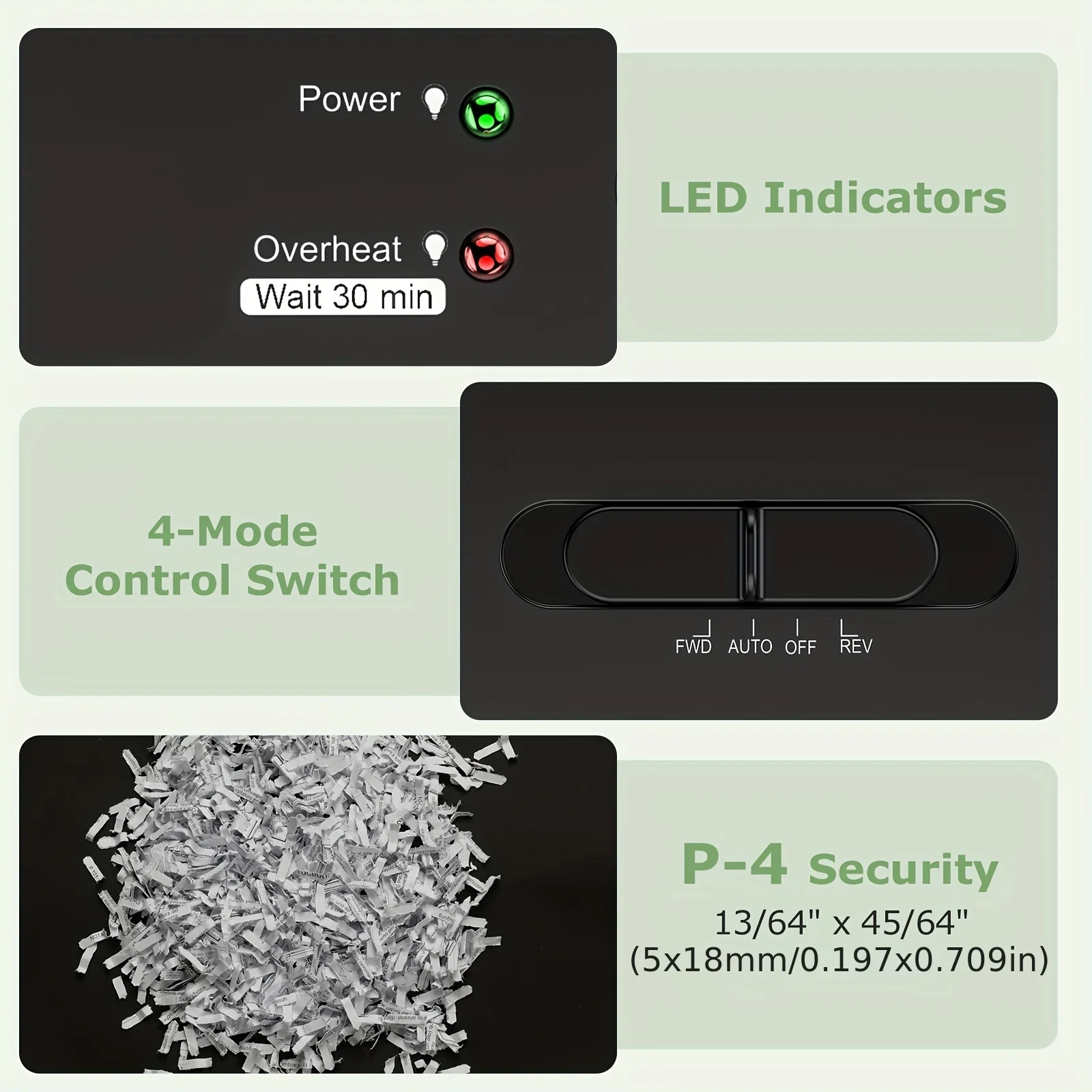 Safe and User-friendly:Featuring auto start/stop and manual reverse functions to prevent paper jams, our shredder is designed with overheating protection technology, ensuring safety, durability, and an extended lifespan.