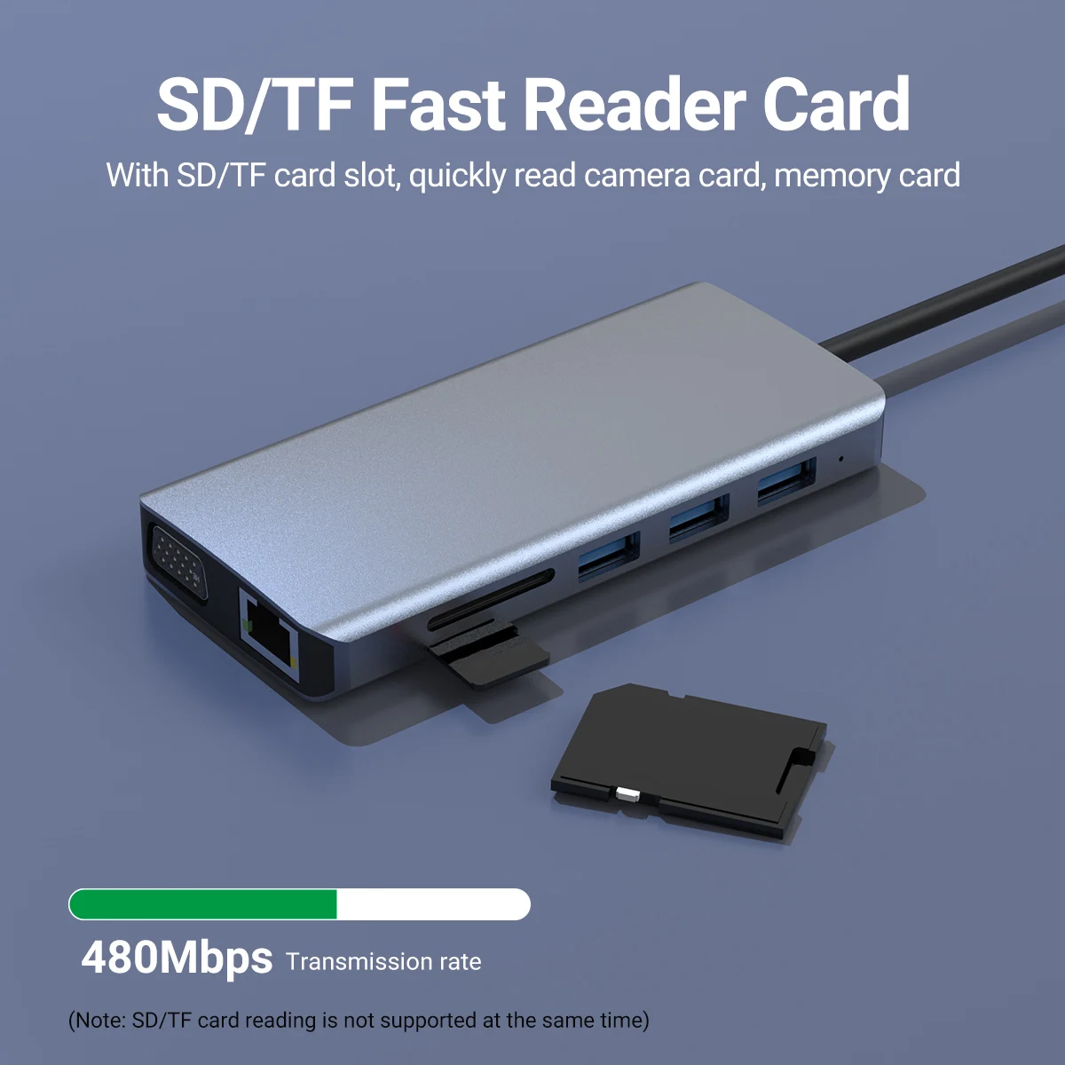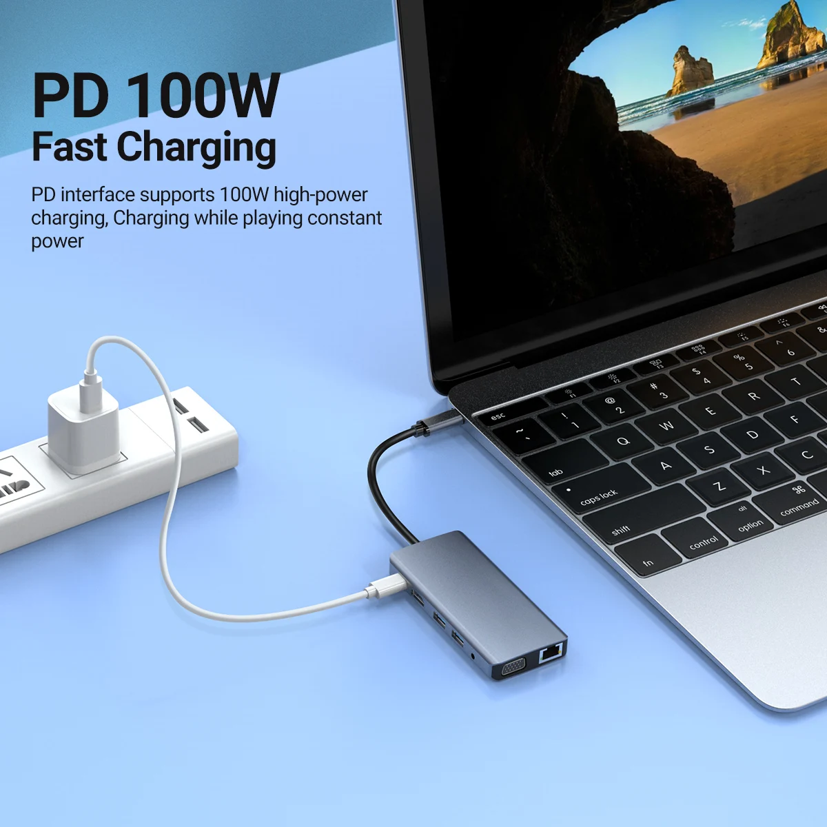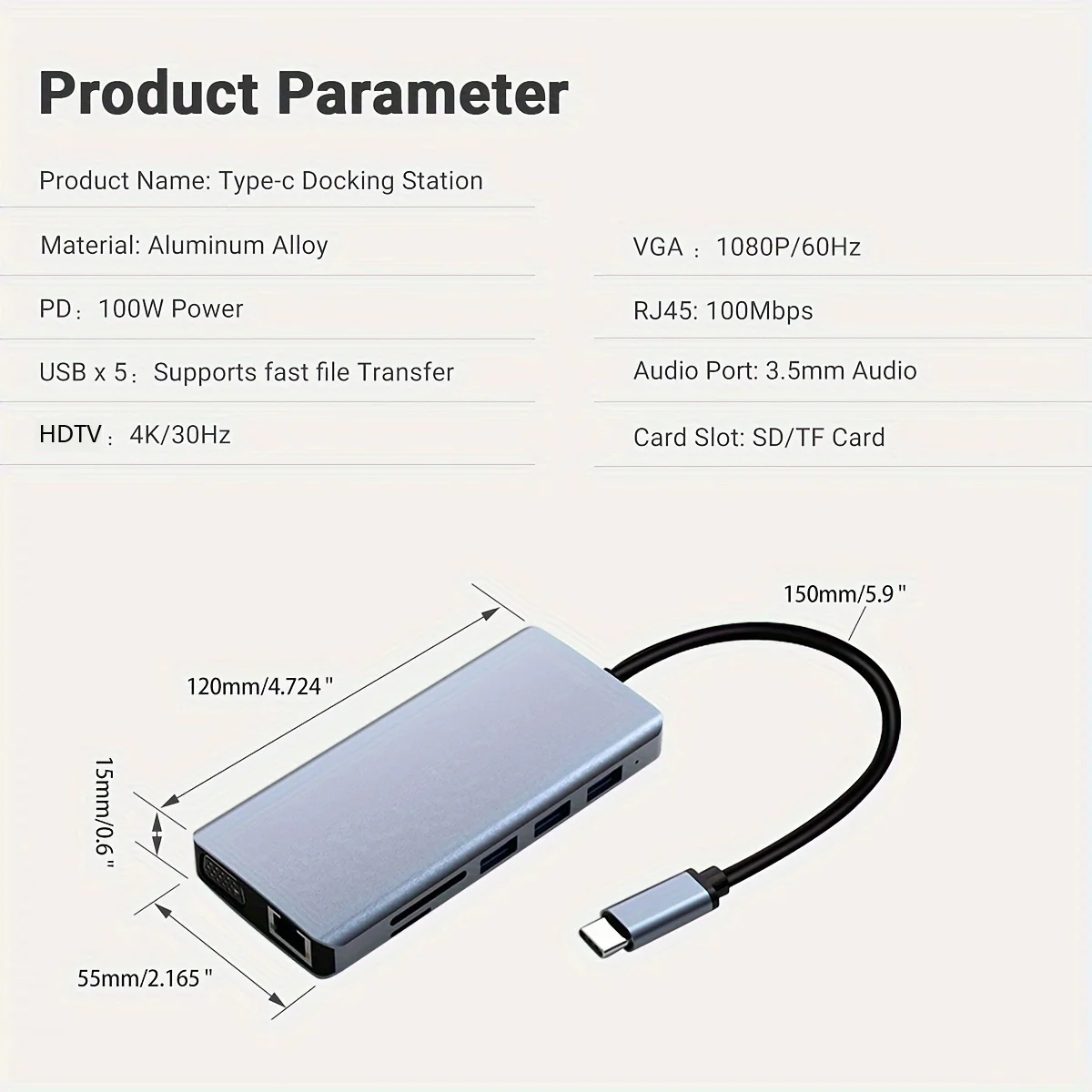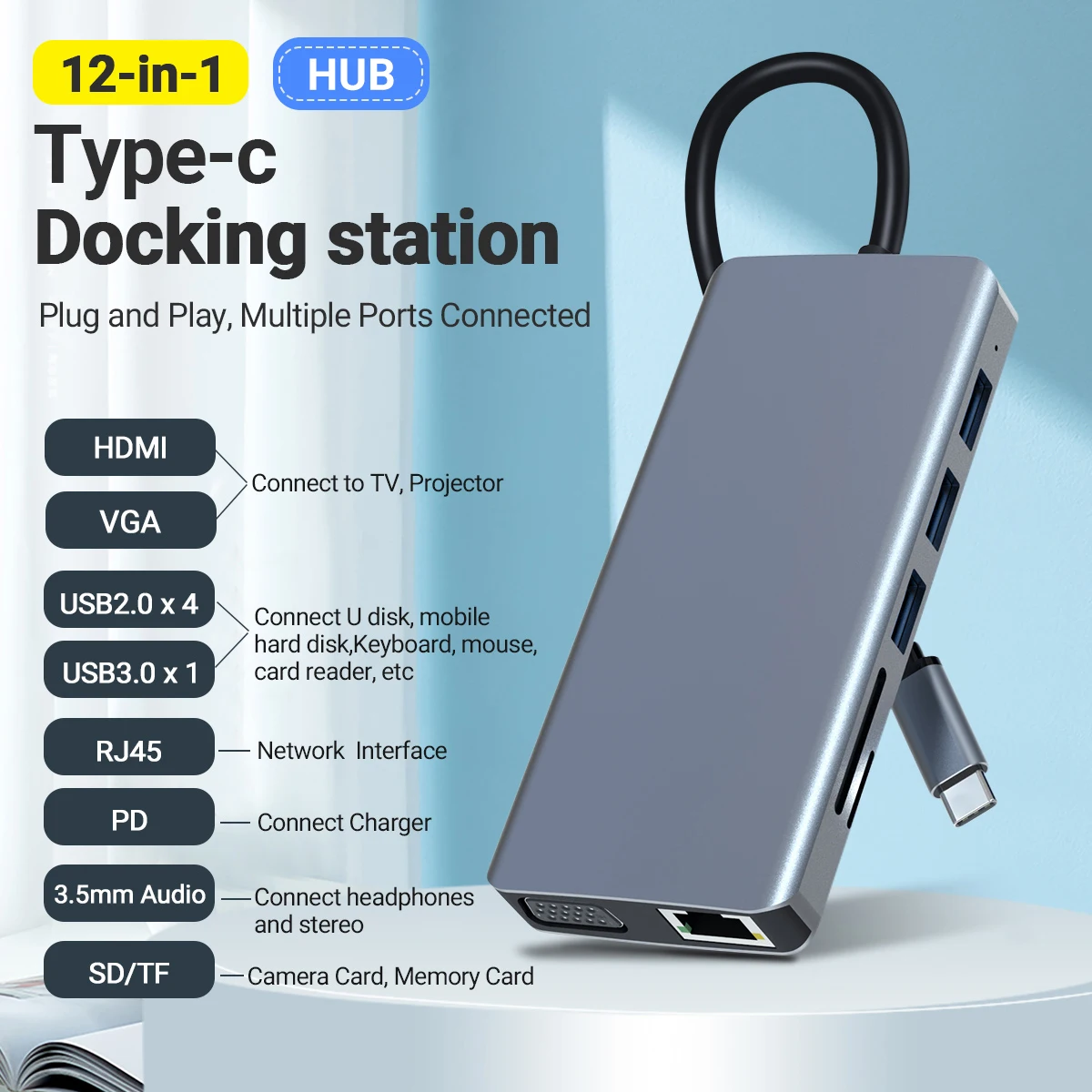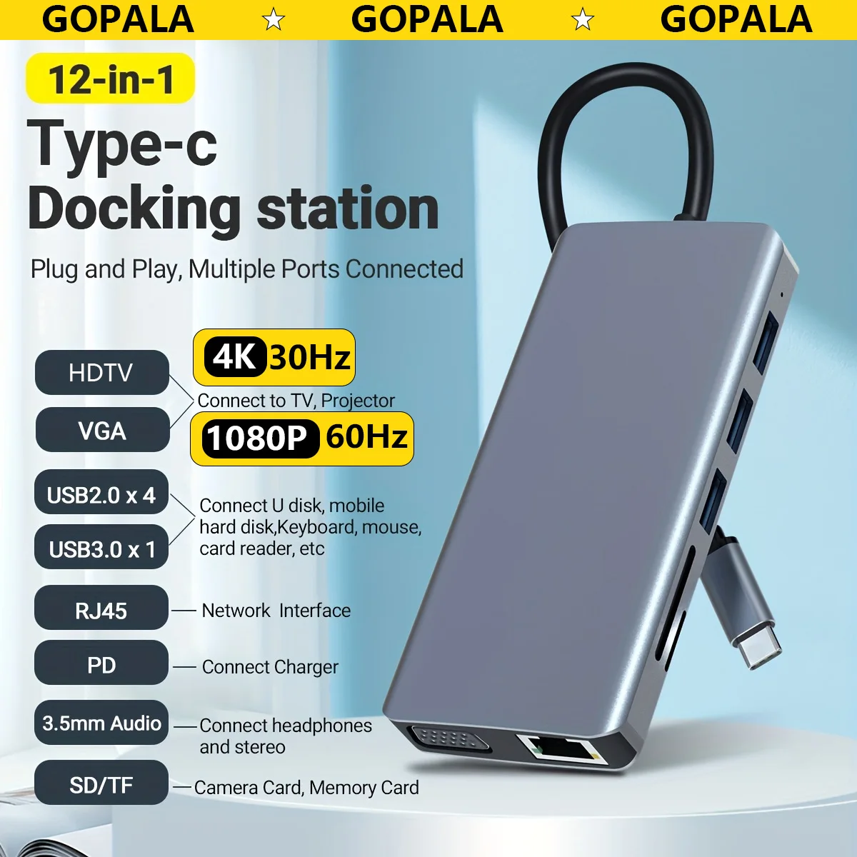 Gopala 12 in 1 Dual Monitor Type-C Hub Docking with HDTV 4K VGA 1080p 5 USB Port 100W PD Charger 100M Ethernet SD/TF Audio