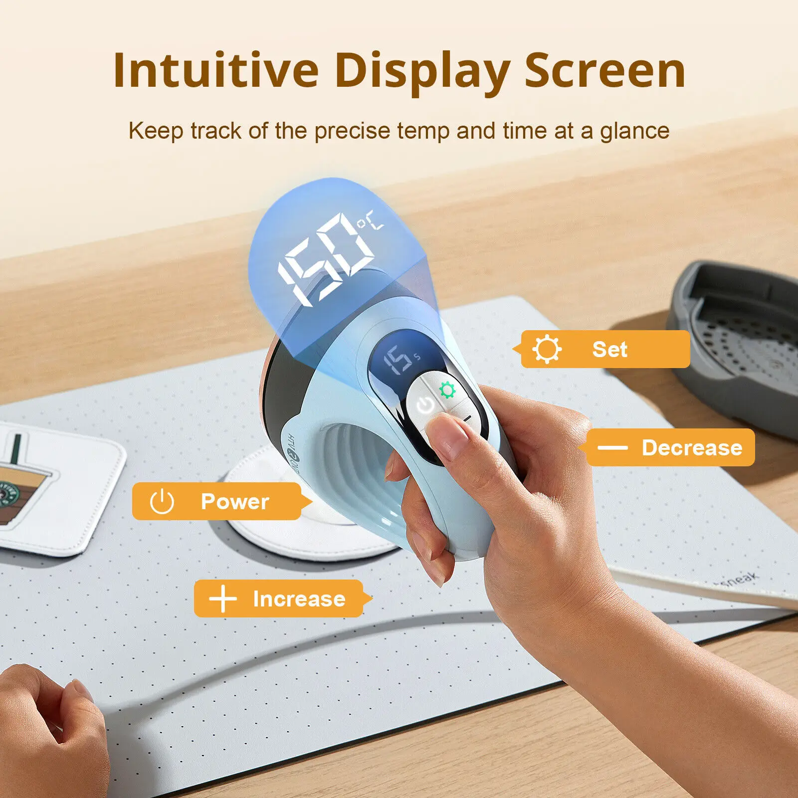 Added a display screen and four silicone buttons, which can adjust the desired temperature and time within the range of 100-200 ℃ and 1-600S, and see the changes in temperature and time. At the same time, it has a pressing timer function, making ironing easy and convenient