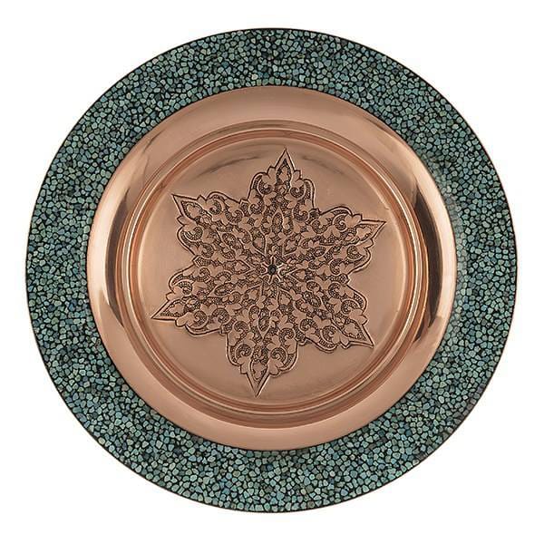 Turquoise is a Persian handicraft, and by putting small pieces of turquoise stone like put mosaic on the surface of the dishes.Between the turquoise pieces there is a dark colored lacquer. If the turquoise dishes are more streamlined and fewer spaces between turquoise pieces, its artistic value is higher.